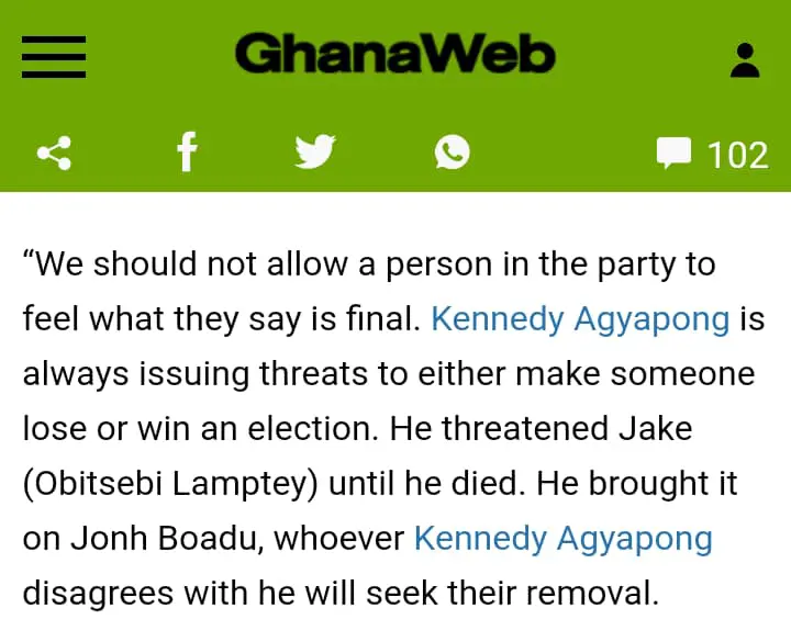 He said “We should not allow a person in the party to feel what they say is final. Kennedy Agyapong is always issuing threats to either make someone lose or win an election. He threatened Jake Obetsebi Lamptey until he died. He brought it on John Boadu, whoever Kennedy agyapong this agrees with he will seek their removal.”