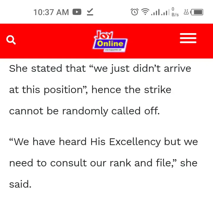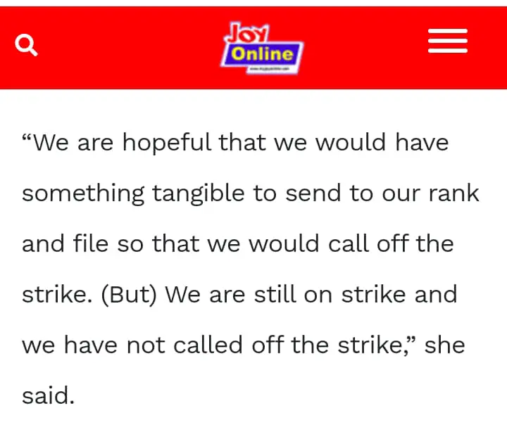 Madam Rebecca Ocran stated “We are hopeful that we would have something tangible to send to our rank and file so that we would call off the strike. (But) We are still on strike and we have not called off the strike,” she stressed.