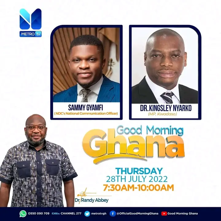 Well, today, Thursday, July 28, 2022, Sammy Gyamfi comes head to head with Dr. Kingsley Nyarko. The NDC Communications Officer is expected to engage the Kwadaso MP on a number of issues relating to the country. Dr. Randy Abbey is expected to host the 2 panelists.